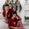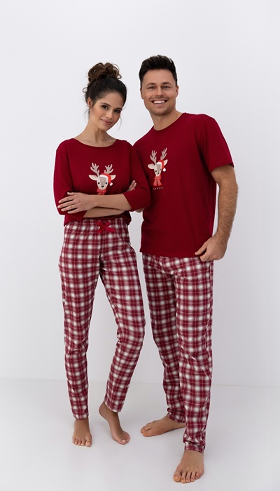 Piżama damska z bluzką z rękawem 3/4 i z długimi spodniami w kratę. Bluzka od piżamy ma okrągły dekolt i grafikę renifera. Spodnie od piżamy są długie, w elegancką kratkę. Idealna piżama damska na Świąteczny prezent dla kobiety! Świąteczna pizama damska od Sensis bordowa ze 100% miękkiej bawełny. Identyczna piżama dostępna też dla panów! Piżama dla par – zestaw damski i męski piżam na Święta!