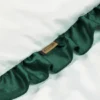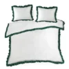 Elegancka jednolita biała pościel wykończona ciemno zieloną falbanką: