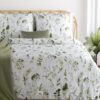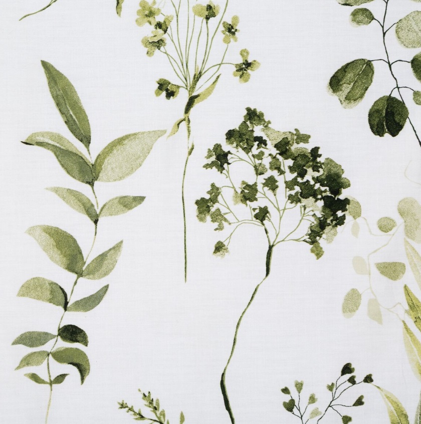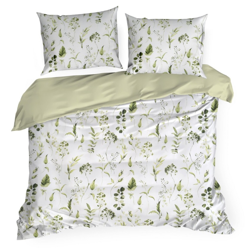 Komplet pościeli z satyny bawełnianej w kolorze biało zielonym w roślinny wzór.