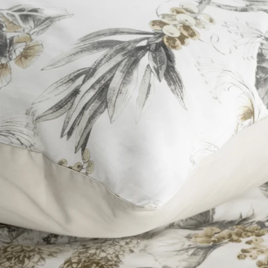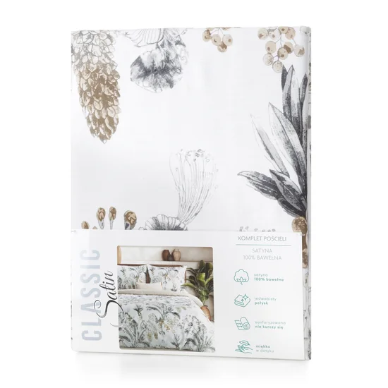 Satynowa bawełniana pościel w biało szaro beżowa w roślinny wzorek: