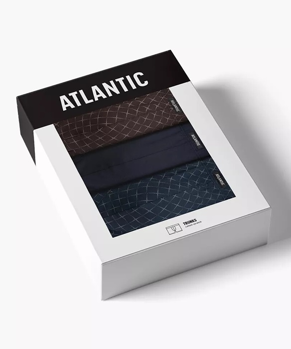 Bokserki męskie Atlantic – zestaw 3 sztuk bawełnianych bokserek męskich. W pasie nieuciskająca gumka z naszytym logo Atlantic. Bokserki męskie uszyte są z wysokiej jakości, miękkiej bawełny. Bokserki męskie pakowane są w pudełko po 3 sztuki.