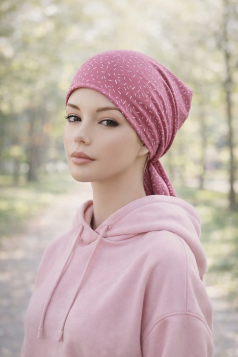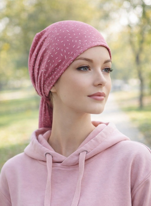 Chustka Maja mini to propozycja dla Pań które szukają lekkiej chustki na głowę na wiosnę, lato, czy po domu. Chustka na głowę Maja uszyta jest z delikatnej tkaniny bawełnianej, z tyłu ma mały ściągacz, a regulowana jest króciutkimi szarfami do zawiązania z tyłu głowy. Bawełna premium jest niezwykle miękka i delikatna. Wygodna prosta i krótka chustka po chemioterapii oraz po leczeniu, dla wszystkich kobiet jako ochrona przed wiatrem i słońcem.