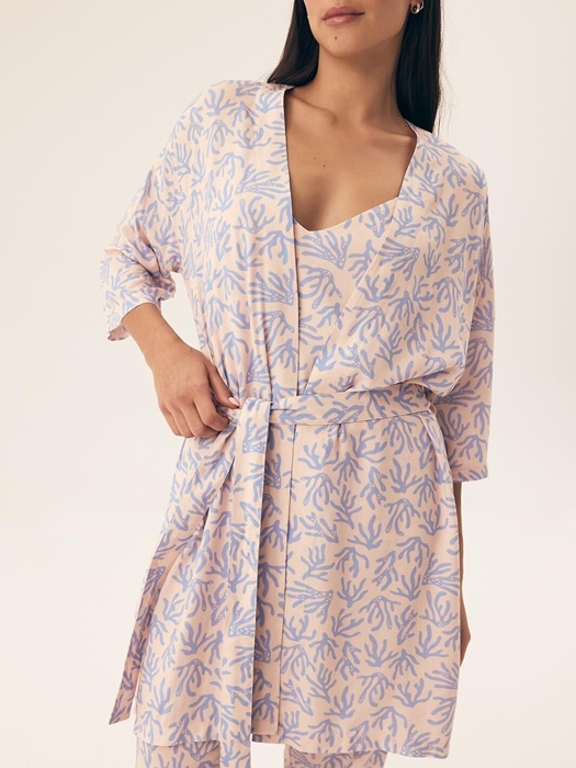 Cienki, lekki szlafrok damski morelowy w niebieskie koralowce. Szlafrok długości do kolan. Szlafrok ze 100% wiskozy w śliczny wzór.