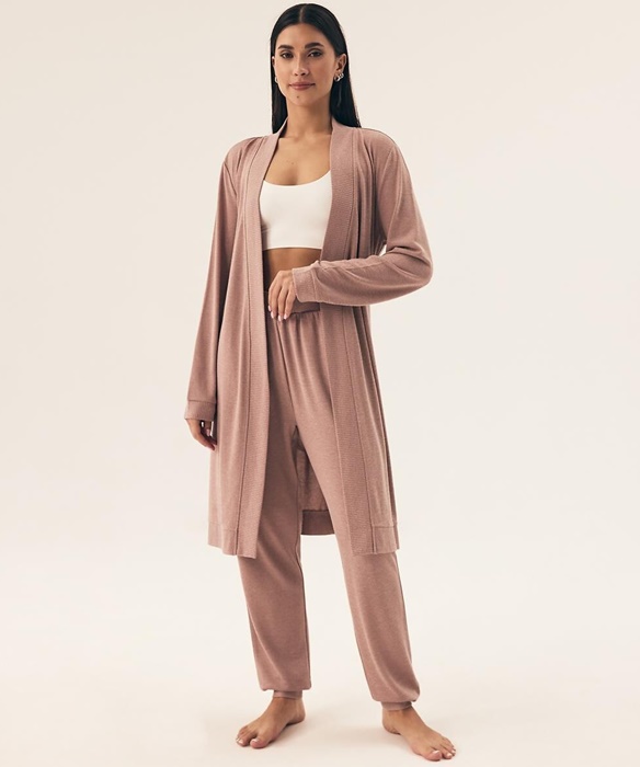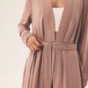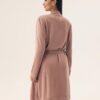 Cienki, lekki szlafrok damski w kolorze kawowego różu. Szlafrok długości do kolan, po bokach ma kieszenie i jest wiązany paskiem. Rękawy są długie. Szlafrok w jednolitym kolorze.