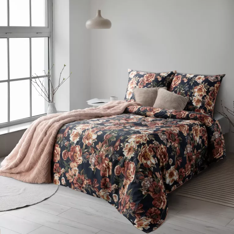 Czarna pościel w różowo brązowe kwiaty – Polska pościel z satyny bawełnianej: