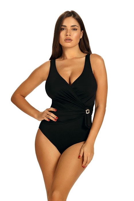 Kostium kąpielowy damski jednoczęściowy BEZ fiszbin ale usztywniany. Elegancki i wygodny kostium kąpielowy damski jednoczęściowy czy to na basen czy na plażę. Miseczki bez fiszbin są usztywniane, więc gwarantują komfort noszenia i wygodę. Ramiączka są regulowane. Pod biustem zdobne przewiązanie oraz klamerka. Na plecach wycięcie.