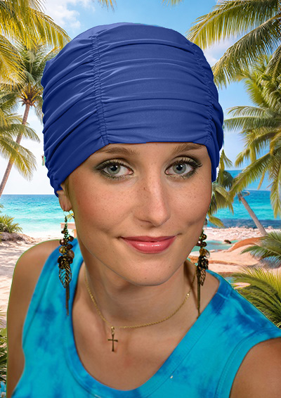 to damski czepek na basen, do pływania, nad morze, nad jezioro, kąpielowy. Chroni głowę przed słońcem, lub też jest niezbędny na krytym basenie. Czepek prezentuje się dużo lepiej od standardowych czepków basenowych, które uciskają głowę. Ten czepek ma lepszy krój oraz ozdobne marszczenia, dzięki czemu twarz dużo lepiej wygląda;)