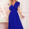 Sukienka do łydek, zwiewna w chabrowym kolorze. Sukienka z eleganckim marszczeniem przy dekolcie i fantazyjnymi rękawkami. Głęboko wcięta na plecach. Podkreślona talia. Sukienka idealna na co dzień, do biura, do pracy, na uroczystości czy na spotkania ze znajomymi.