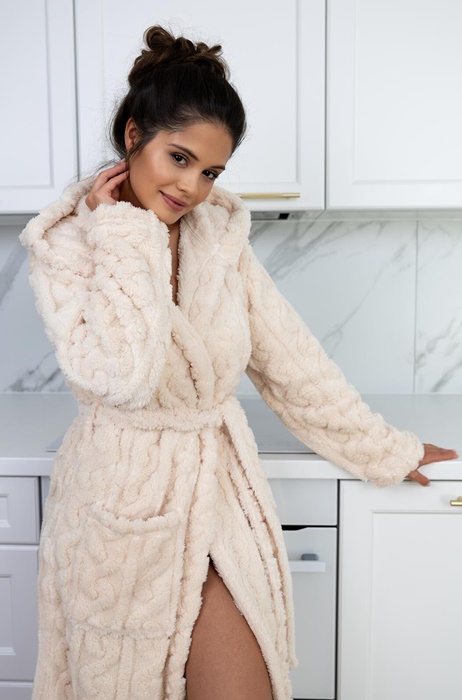 Ciepły Szlafrok damski długości do łydki z miękkiej i puszystej dzianiny. Puszysty i gruby szlafrok – w sam raz na chłodniejsze wieczory, noce i poranki. Na biodrach praktyczne kieszenie, kaptur i warkoczowa struktura. Bardzo elegancki fason ciepłego szlafroka damskiego.