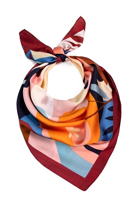 Elegancka Satynowa apaszka damska w kolorowy wzór. Kwadratowa apaszka damska – do wiązania na głowie, pod szyją, przy torebce, czy też jako ozdobny dodatek do stylizacji.