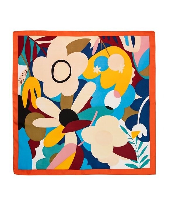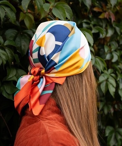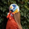 Elegancka Satynowa apaszka damska w kolorowy wzór. Kwadratowa apaszka damska – do wiązania na głowie, pod szyją, przy torebce, czy też jako ozdobny dodatek do stylizacji.