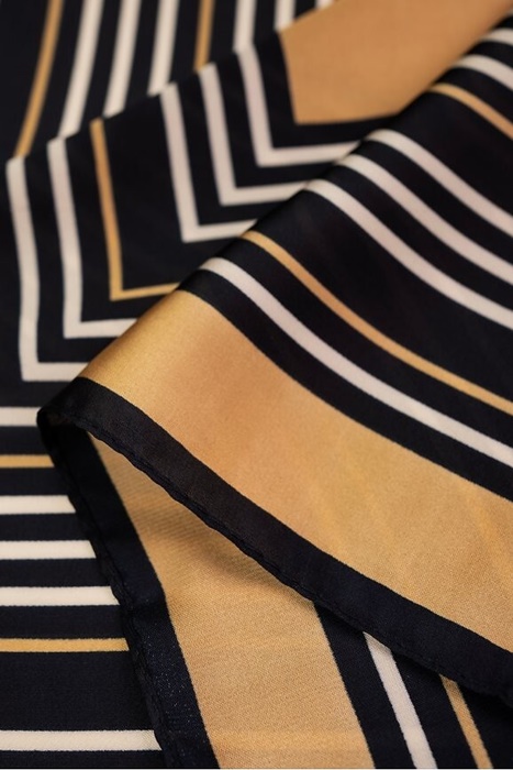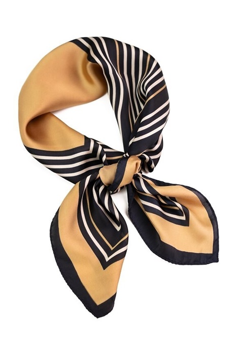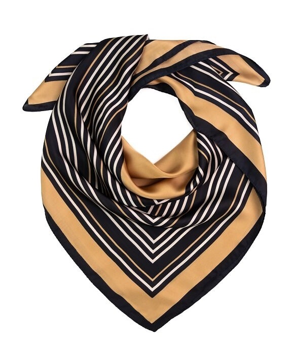 Elegancka Satynowa apaszka damska we wzór w pasy. Kwadratowa apaszka damska – do wiązania na głowie, pod szyją, przy torebce, czy też jako ozdobny dodatek do stylizacji.