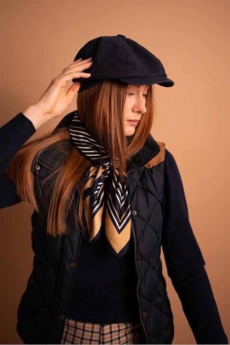 Elegancka Satynowa apaszka damska we wzór w pasy. Kwadratowa apaszka damska – do wiązania na głowie, pod szyją, przy torebce, czy też jako ozdobny dodatek do stylizacji.