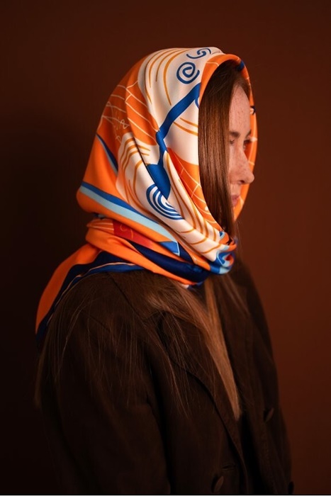 Elegancka Satynowa apaszka damska wzorzysta o wymiarach 70cm na 70cm. Kwadratowa apaszka damska – do wiązania na głowie, pod szyją, przy torebce, czy też jako ozdobny dodatek do stylizacji.