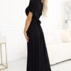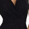 Elegancka długa Sukienka Jennifer – długa suknia z brokatowego czarnego materiału. Posiada elegancki kopertowy dekolt, krótkie rękawki motylki oraz rozcięcie na nodze, które dodaje kobiecego wdzięku. Fason sukienki z paskiem pięknie podkreślającym talię. Połyskujący materiał nadaje sukience blasku i elegancji. Sukienka długa idealna na wieczorne wyjścia, bale, Święta, komunię, śluby i inne eleganckie przyjęcia.