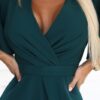 Elegancka długa Sukienka – długa suknia z zielonego materiału. Posiada elegancki kopertowy dekolt, krótkie rękawki motylki oraz rozcięcie na nodze, które dodaje kobiecego wdzięku. Fason sukienki z paskiem pięknie podkreślającym talię. Sukienka długa idealna na wieczorne wyjścia, bale, Święta, komunię, śluby i inne eleganckie przyjęcia.