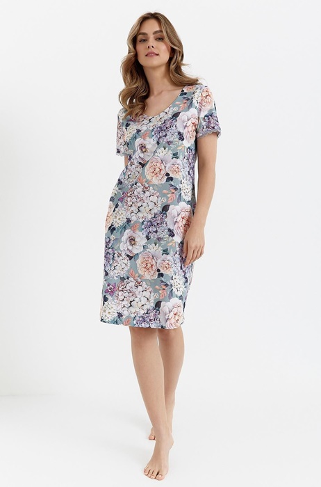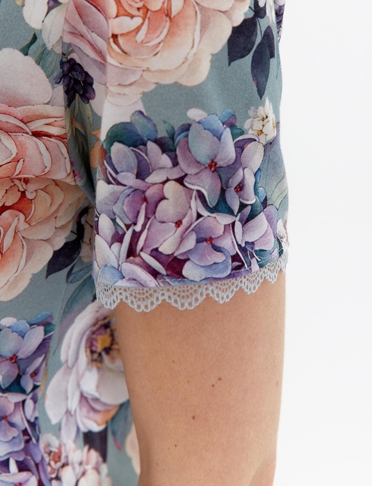 Koszula nocna damska z krótkim rękawem, wykończonym koronką. Koszula długości do kolan w piękny kwiatowy wzór. Koszula nocna jest uszyta ze 100% bawełny. Wygodna i miękka bawełniana koszula nocna z dekoltem w serek. Elegancki niebiesko-szałwiowy kolor.