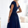 Elegancka Sukienka Matilde o długości midi – lekko za kolano, z brokatowego granatowego materiału. Posiada elegancki dekolt na zakładkę i krótkie rękawki. Fason sukienki z podkreśloną talią. Połyskujący materiał nadaje sukience blasku i elegancji. Sukienka midi idealna na wieczorne wyjścia, bale, Święta, komunię, śluby i inne eleganckie przyjęcia.