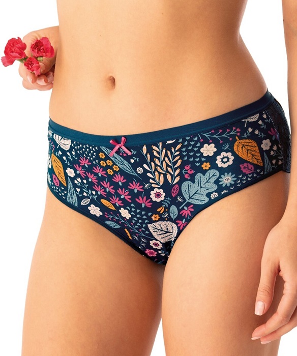Majtki damskie typu figi, biodra lekko zabudowane, zdobne wykończenia brzegów. Eleganckie Figi damskie pakowane po 2 sztuki. W pasie elastyczna płaska gumka.