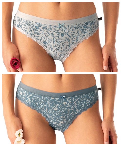 Majtki damskie o klasycznym kroju, obniżona linia bioder, detale z koronki, w pasie wygodna gumka. Eleganckie Figi damskie pakowane po 2 sztuki.