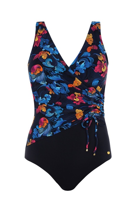 Kostium kąpielowy damski jednoczęściowy BEZ fiszbin czarno granatowy. Wygodny i stylowy strój kąpielowy damski jednoczęściowy idealny i na basen i na plażę. Miseczki są usztywnione, ale bez fiszbin, gwarantują więc komfort noszenia i wygodę. Kostium kąpielowy na ramiączkach z regulacją. Po boku przewiązanie i marszczenie.