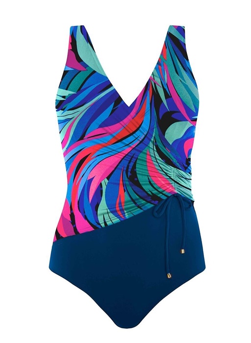 Kostium kąpielowy damski jednoczęściowy BEZ fiszbin, z wysokiej jakości odpornego na chlor i słońce materiału. Wygodny i stylowy strój kąpielowy damski jednoczęściowy idealny i na basen i na plażę. Miseczki są usztywnione, ale bez fiszbin, gwarantują więc komfort noszenia i wygodę. Kostium kąpielowy na ramiączkach, z boku z marszczeniem i ze zdobnym przewiązaniem troczkiem. Fason optycznie wyszczuplający sylwetkę. Ramiączka z regulacją.