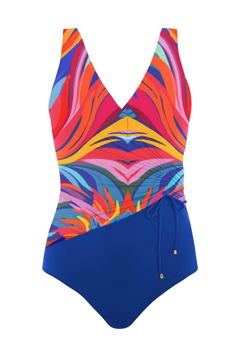 Kostium kąpielowy damski jednoczęściowy BEZ fiszbin, z wysokiej jakości odpornego na chlor i słońce materiału. Wygodny i stylowy strój kąpielowy damski jednoczęściowy idealny i na basen i na plażę. Miseczki są usztywnione, ale bez fiszbin, gwarantują więc komfort noszenia i wygodę. Kostium kąpielowy na ramiączkach, z boku z marszczeniem i ze zdobnym przewiązaniem troczkiem. Fason optycznie wyszczuplający sylwetkę. Ramiączka nieodpinane z regulacją. Miseczki delikatnie usztywnione.