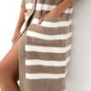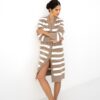 Ciepły kardigan / Szlafrok damski długości do kolan z miękkiej dzianiny w paski. Puszysty ciepły szlafrok damski na guziki – świetny jako podomka czy kardigan – w sam raz na chłodniejsze wieczory, noce i poranki. Szlafrok / kardigan bez kaptura w elegancki wzór w paski, zapinany na guziki. Bardzo elegancki fason ciepłego szlafroka damskiego. Szlafrok damski ciepły, miękki i wygodny – kardigan damski ecru kawowy.