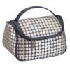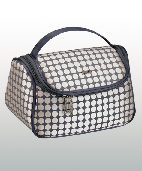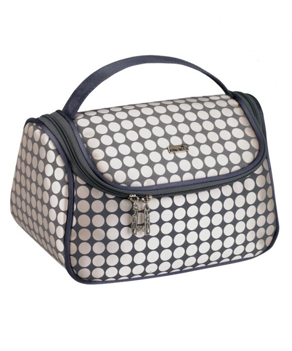 Piękny Kuferek Kosmetyczka szara w duże srebrne groszki. W środku trzy trzymające gumki na drobniejsze rzeczy oraz zamykana na suwak przegródka. Idealna jako kosmetyczka kuferek w podróż, na wyjazd, do walizki. Kosmetyczka pomieści rzeczy typu: pasta do zębów, szczoteczka do zębów, maszynka do golenia, pędzle i akcesoria do makijażu, kremy w słoiczkach, nie-długą szczotkę do włosów, średniej wielkości szampon i płyny do mycia…