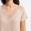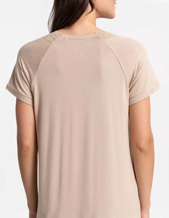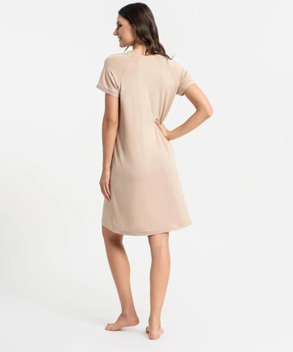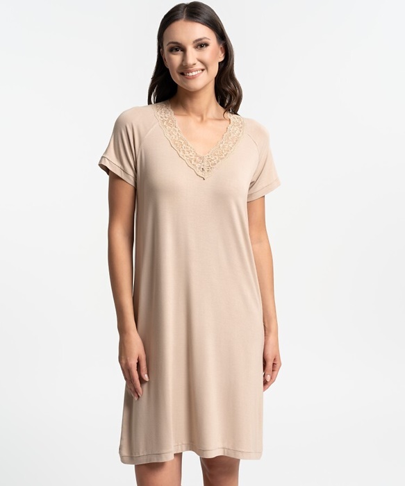 Koszula nocna z krótkim rękawem jednolita, beżowa. Koszulka ma dekolt w szpic ozdobiony koronką. Koszula nocna krótka, elegancka i prosta.