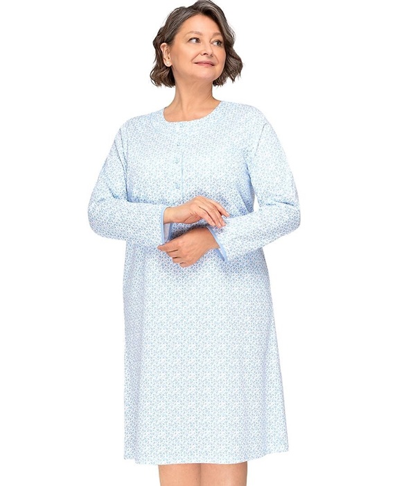 Koszula nocna z długimi rękawami, długość za kolana, z okrągłym dekoltem. Koszula nocna uszyta jest z miękkiej 100% bawełny. Koszula damska częściowo rozpinana – u góry ma 5 guzików, co ułatwia jej zakładanie i zdejmowanie, kontrolę lekarską w szpitalu czy też karmienie piersią.