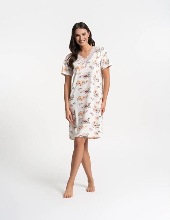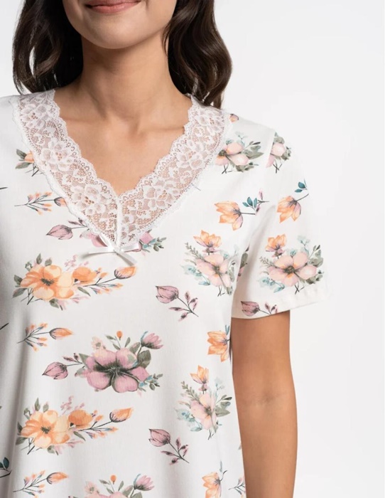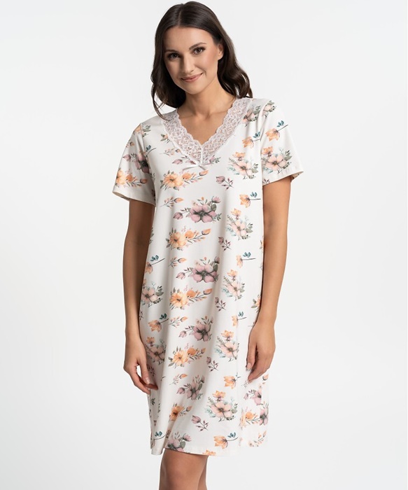 Koszula nocna bawełniana krótki rękaw koronka ecru w kwiaty
