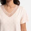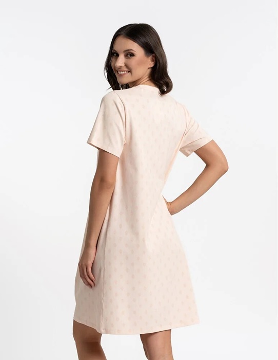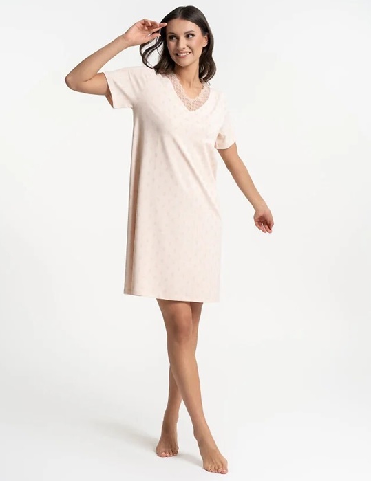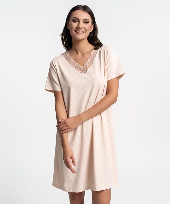 Koszula nocna z krótkim rękawem w elegancki wzorek. Koszulka ma dekolt w szpic ozdobiony koronką. Koszula nocna krótka uszyta jest z bawełny – idealny wybór na lato i upały.