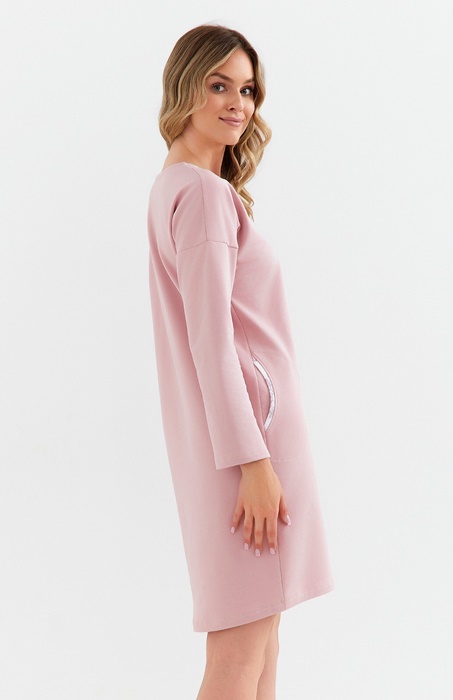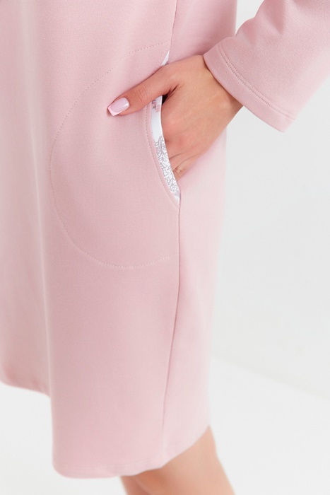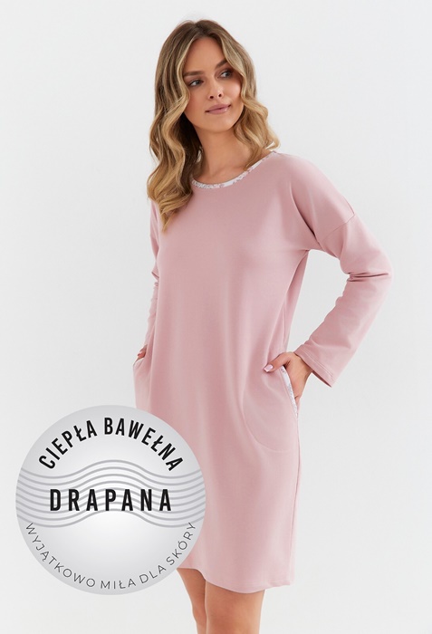 Koszula nocna damska z długimi rękawami, długa do kolan. Koszula jest uszyta ze 100% bawełny, ma okrągły dekolt. Wygodna i miękka bawełniana koszula nocna z ciepłej, grubej bawełny drapanej. Piękna koszula nocna ocieplana. Po bokach koszuli są kieszonki. Koszula w ślicznym pudrowo różowym kolorze.
