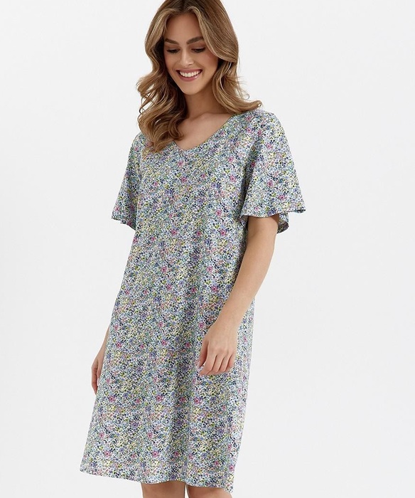 Koszula nocna damska z krótkim rękawem. Koszula długości do kolan w piękny kwiatowy wzór. Koszula nocna jest uszyta ze 100% bawełny. Wygodna i miękka bawełniana koszula nocna z dekoltem w łódkę. Bawełniana koszula nocna z luźnym szerokim rękawkiem. Idealna dla Pań o mocnych ramionach – luźny rękaw maskuje szersze ramiona.