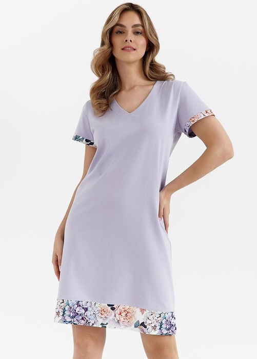 Koszula nocna damska z krótkim rękawem. Koszula długości do kolan liliowa. Koszula nocna jest uszyta z bawełny. Wygodna i miękka bawełniana koszula nocna z dekoltem w szpic i kwiatowymi lamówkami. Rękawki i dół koszuli wykończone są kontrastującym materiałem w kwiaty.