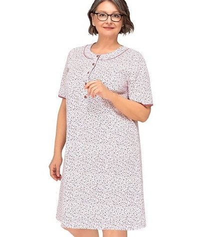 Koszula nocna z krótkimi rękawami, długość za kolana, z okrągłym rozpinanym dekoltem. Koszula nocna uszyta jest z miękkiej 100% bawełny. Koszula damska częściowo rozpinana – u góry ma 5 guzików, co ułatwia jej zakładanie i zdejmowanie, kontrolę lekarską w szpitalu czy też karmienie piersią. Idealna koszula nocna dla babci, czy dla mamy karmiącej.