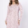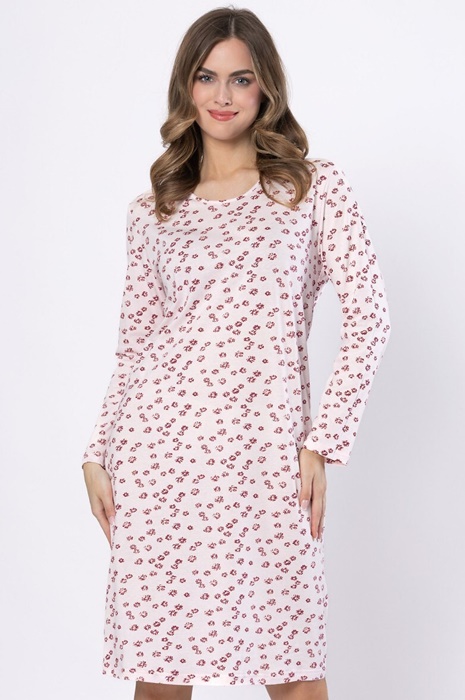 Koszula nocna z długim rękawem, długa do kolan, dekolt okrągły. Koszula nocna uszyta jest ze 100% bawełny. Jasno różowa koszula nocna z długim rękawem we wzorek.