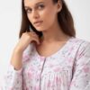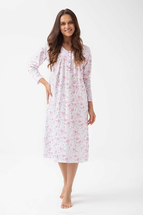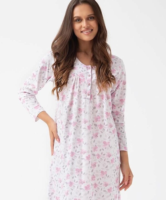 Koszula nocna z długimi rękawami, długość lekko za kolano i dekolt okrągły, rozpinany. Koszula nocna uszyta jest z miękkiej 100% bawełny. Koszula damska częściowo rozpinana – u góry ma 4 guziki, co ułatwia jej zakładanie i zdejmowanie. Koszula nocna idealna do porodu, do karmienia, do szpitala, czy na co dzień.