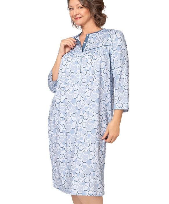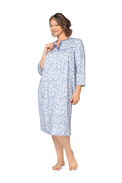 Koszula nocna z długim rękawem, długość za kolana i okrągły dekolt, rozpinany u góry. Koszula nocna uszyta jest z miękkiej 100% bawełny. Koszula damska częściowo rozpinana – u góry ma 5 guzików, co ułatwia jej zakładanie i zdejmowanie, kontrolę lekarską w szpitalu czy też karmienie piersią. Piękna koszula nocna z długim rękawem na chłodniejsze noce czy do szpitala. Koszula w elegancki niebieski wzór w koła.
