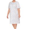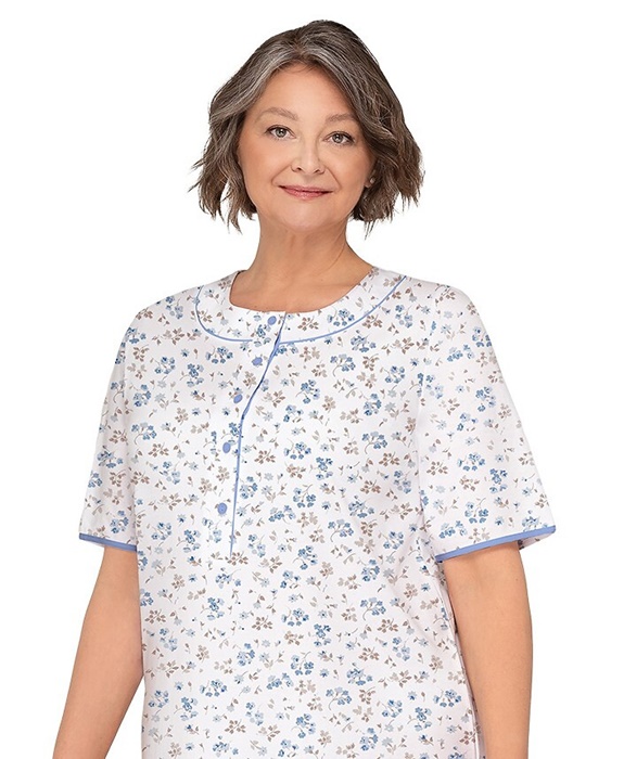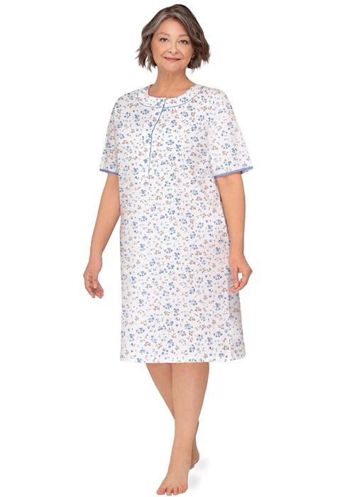 Koszula nocna z krótkimi rękawami, długość za kolana, z okrągłym rozpinanym dekoltem. Koszula nocna uszyta jest z miękkiej 100% bawełny. Koszula damska częściowo rozpinana – u góry ma 5 guzików, co ułatwia jej zakładanie i zdejmowanie, kontrolę lekarską w szpitalu czy też karmienie piersią. Idealna koszula nocna dla babci, czy dla mamy karmiącej.