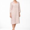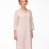 Koszula nocna z długim rękawem 7/8 długości, długość koszuli za kolana i dekolt w łódkę, rozpinana. Koszula nocna uszyta jest z miękkiej 100% bawełny. Koszula damska częściowo rozpinana – u góry ma 3 guziki, co ułatwia jej zakładanie i zdejmowanie, kontrolę lekarską w szpitalu czy też karmienie piersią. Piękna koszula nocna z rękawem 7/8 na chłodniejsze noce czy do szpitala. Koszula w elegancki wzór.