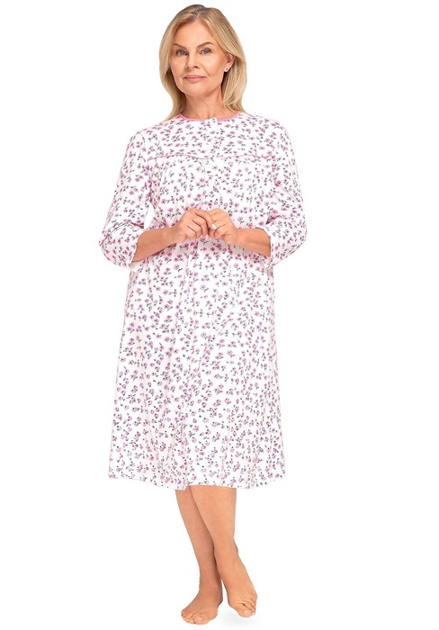 Koszula nocna z długim rękawem 3/4 długości, długość koszuli za kolana i okrągły dekolt, rozpinany u góry. Koszula nocna uszyta jest z miękkiej 100% bawełny. Koszula damska częściowo rozpinana – u góry ma 5 guzików, co ułatwia jej zakładanie i zdejmowanie, kontrolę lekarską w szpitalu czy też karmienie piersią. Piękna koszula nocna z długim rękawem na chłodniejsze noce czy do szpitala. Koszula w elegancki wzór.