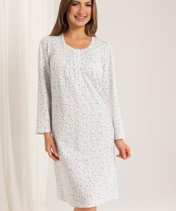 Koszula nocna damska z długim rękawem, długości lekko za kolana, z okrągłym, rozpinanym dekoltem. Koszula nocna uszyta jest z miękkiej 100% bawełny i jest rozpinana u góry (5 guzików). Wygodna koszula nocna bawełniana Regina rozpinana u góry.