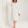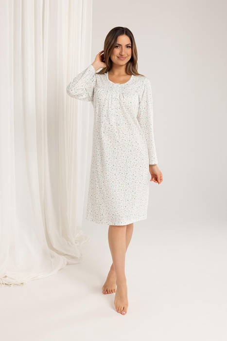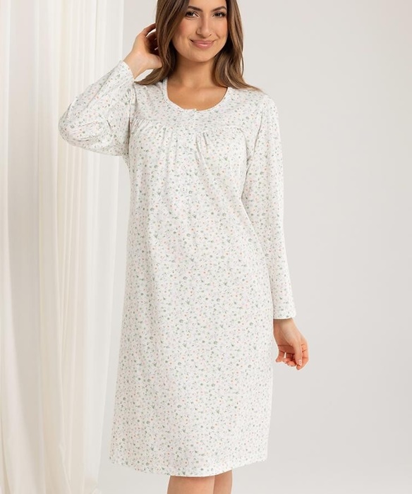 Koszula nocna damska z długim rękawem, długości lekko za kolana, z okrągłym, rozpinanym dekoltem. Koszula nocna uszyta jest z miękkiej 100% bawełny i jest rozpinana u góry (5 guzików). Wygodna koszula nocna bawełniana Regina rozpinana u góry.