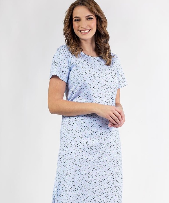 Koszula nocna damska z krótkimi rękawami, długa za kolana, z okrągłym dekoltem i rozcięciami u dołu. Koszula nocna uszyta jest z miękkiej 100% bawełny we wzór w serduszka. Wygodna koszula nocna bawełniana Regina.