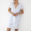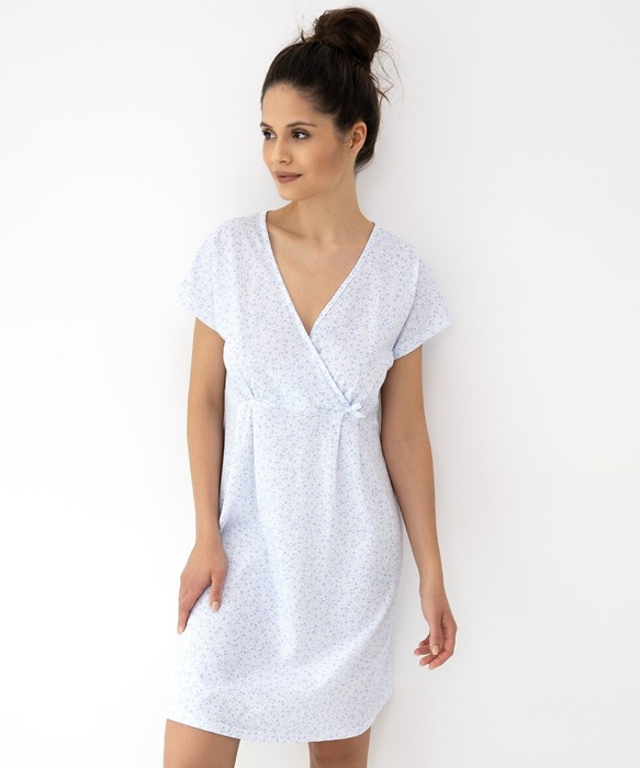Koszula nocna bawełniana jasno błękitna z dekoltem na zakładkę rozchylanym. Koszula długości do kolan, ma dekolt na zakładkę w szpic. Koszula nocna z krótkim rękawem idealna dla mamy karmiącej czy do szpitala. Koszula nocna ze 100% bawełny.