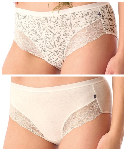 Majtki damskie o kroju midi, biodra lekko zabudowane, u dołu detale z koronki. Eleganckie Figi damskie pakowane po 2 sztuki. W pasie elastyczna płaska gumka.