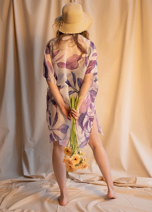 Pareo damskie, lekkie, zwiewne pareo, biało zielone w listki. Idealne jako lekka damska tunika plażowa. Świetny dodatek do kostiumu kąpielowego. Tunika zszyta pod pachami, dzięki czemu się nie zsuwa. Ma długość do kolan. Z lekkiej, oddychającej wiskozy.