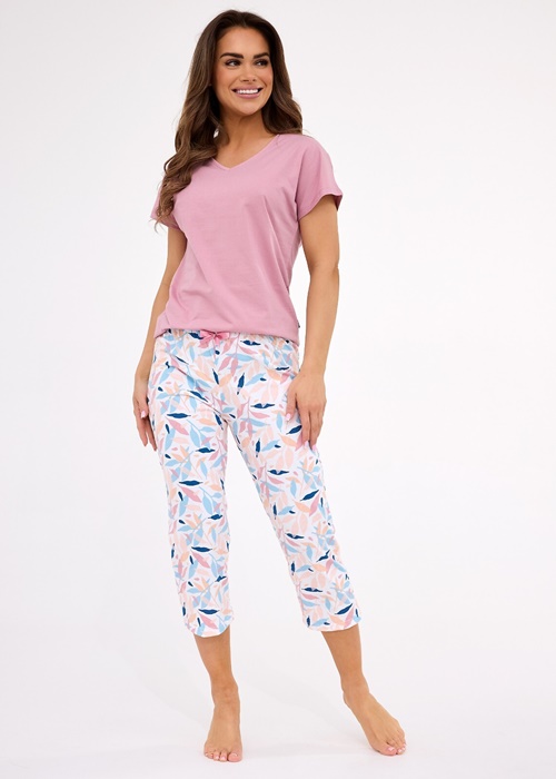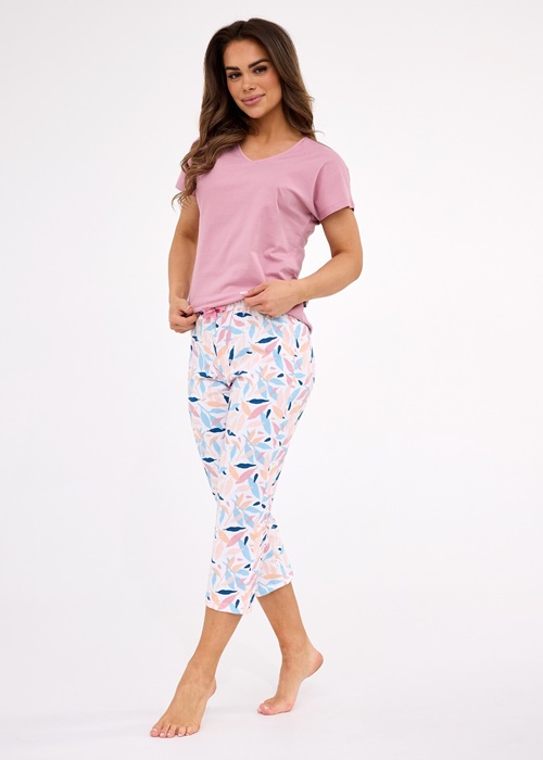 Piżama damska ze spodenkami 3/4 długości oraz krótkim rękawem. Bluzka od piżamy ma dekolt w szpic. Piżama damska uszyta jest ze 100% bawełny. Piżama damska w pięknych pastelowych kolorach. Spodnie rybaczki w listki z kokardką w pasie.